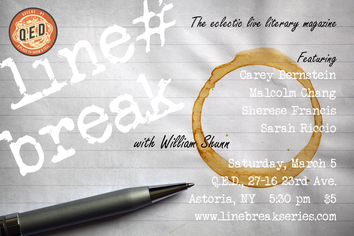 Line Break is here! It's the eclectic live literary magazine where poetry meets prose, fact meets fiction, and high-brow meets low-brow, at fabulous Q.E.D. in Astoria, Queens. At every show, live-lit veteran William Shunn brings a wild assortment of writers...
